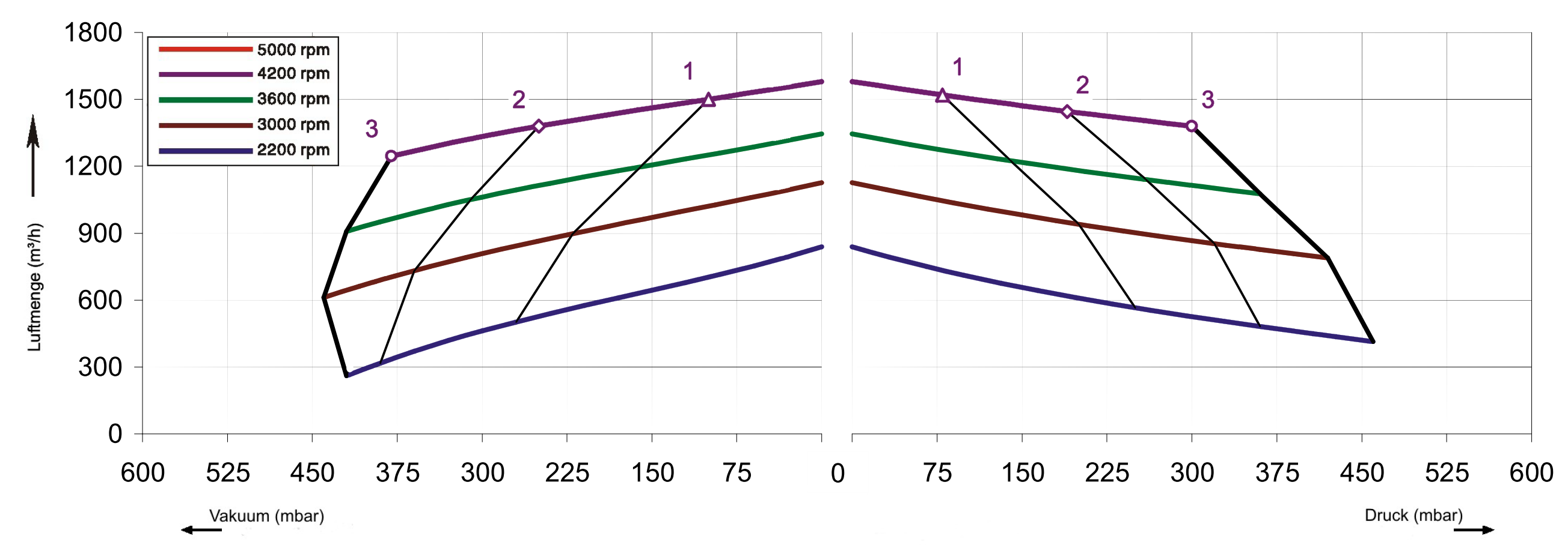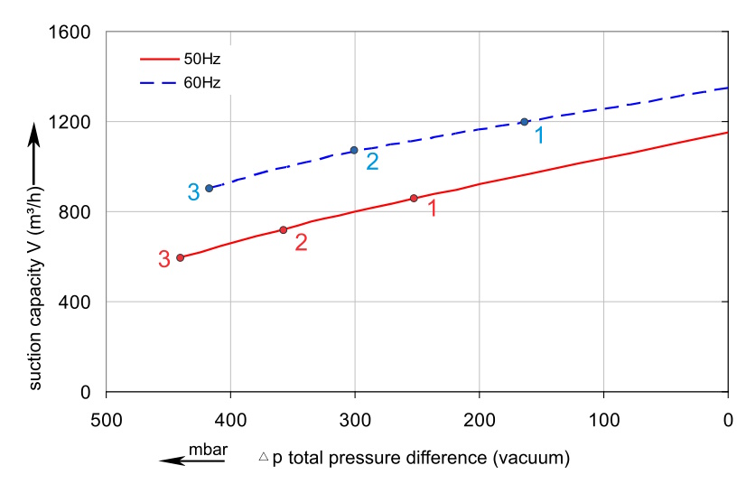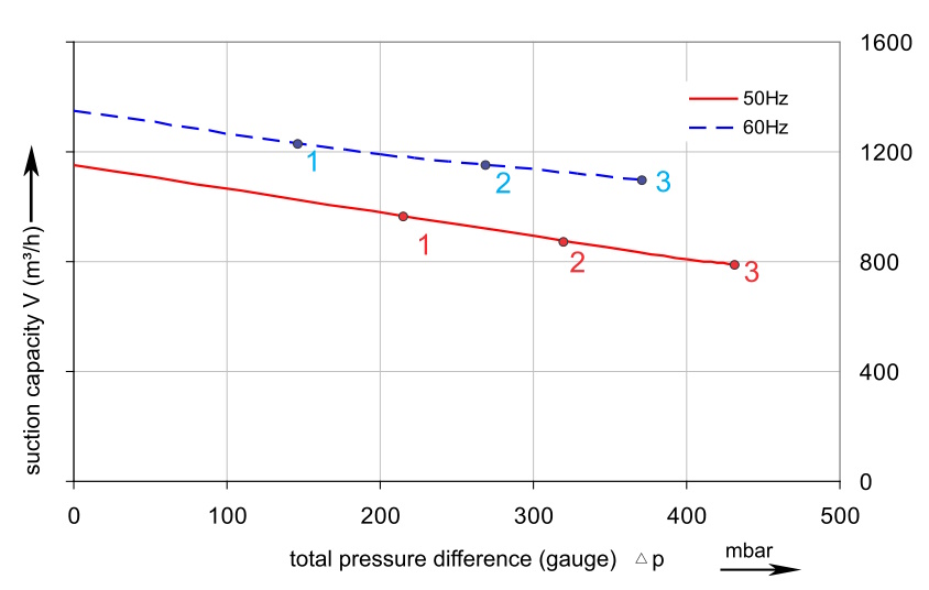 2-traps zijkanaalventilator met de volgende technische specificaties bij 50 Hz: