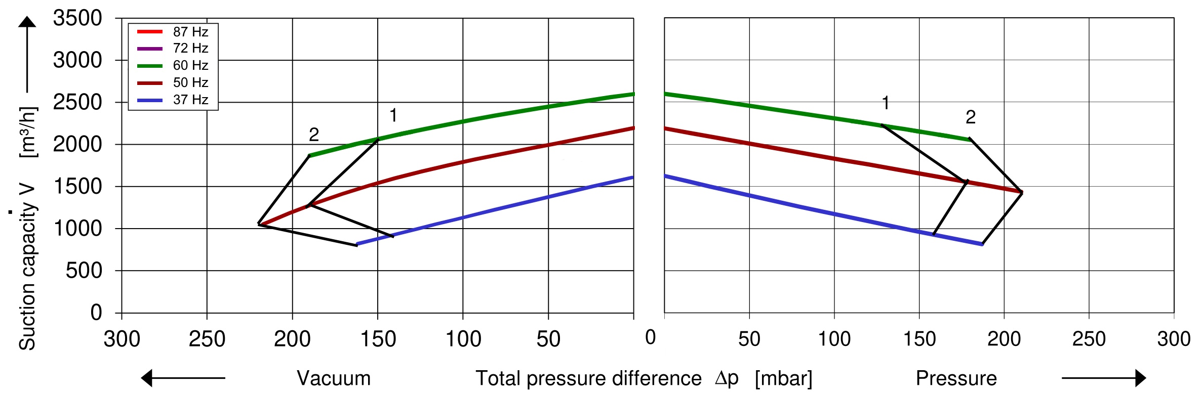 1-traps zijkanaalventilator met de volgende technische specificaties bij 50 Hz: